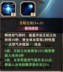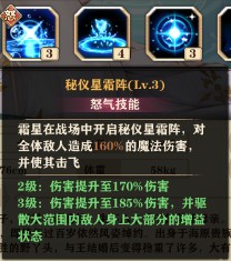 技能三可以迅速补充全体友军的怒气和攻击力,很好加快攻击的频率,增加队友释放大招的次数,令霜星不但是一个强大的法师还是个兼职牧师。
