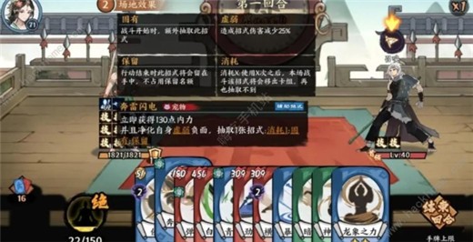4.华山剑法华山圆满的被动,可以增加40的临时臂力,所以在输出前可以先丢一张华山剑法提升臂力,龙象齐鸣等百分比增加臂力的招式,尽量留在第三、回合后,利用临时臂力固化1000左右的固有臂力,方便后续输出。