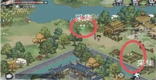 2、接着我们就来到了湖畔和小镇当中,在此位置就可以看到两个标记好的采集点。