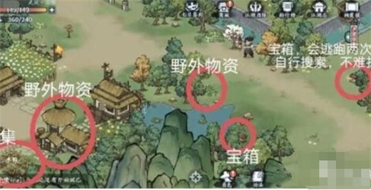 6、在此位置,我们就继续按照画面上标记出来的位置寻找到野外物资和宝箱,这时候我们需要注意的宝箱会逃跑两次,自行搜索即可。