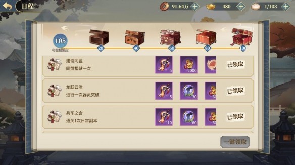 6、最后我们进入到“日程”系统,如下图,完成同盟建设、器灵突破、日常副本后也可以在这里领取经验