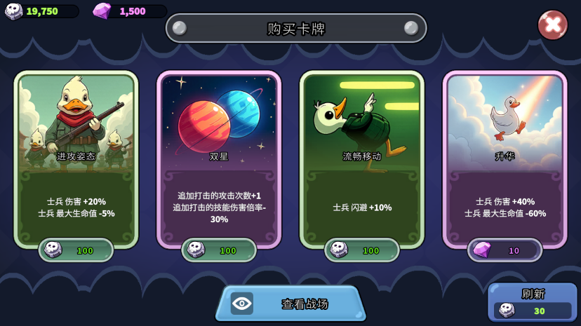 1、组建你的鸭子战队,从普通小鸭到强力英雄鸭,每种鸭子都有独特技能,看着它们摇摇摆摆上战场的样子特别治愈。