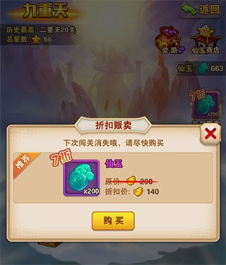 4、在每次闯关后,系统会推送1个折扣道具来卖给玩家,7折哦!真的不可错过!