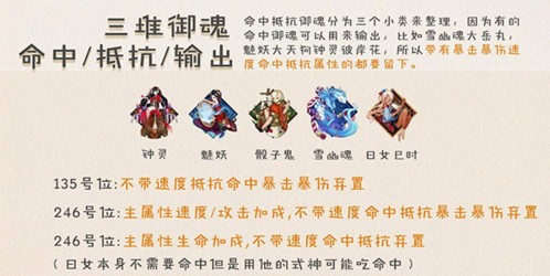 命中抵抗御魂分为三个小类来整理,因为有的命中御魂可以用来输出,比如雪幽魂大岳丸,魅妖大天狗钟灵彼岸花,所以带有暴击暴伤速度命中抵抗属性的都要留下。日女需要注意一下,他本身是不吃命中的,但是使用他的式神可能技能本身需要命中,所以也尽可能留一下。