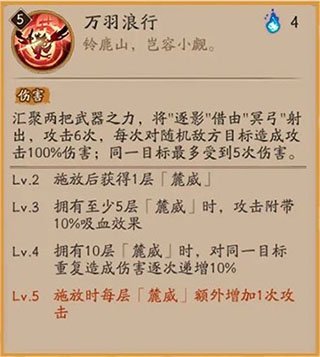 三技能“万羽浪行”是随机伤害技能,类似犬夜叉、烬天玉藻前大招,初始造成6次100%攻击力的伤害,根据施放技能时“麓烕”的层数追加攻击次数与额外效果,同一目标最多受到5次伤害。