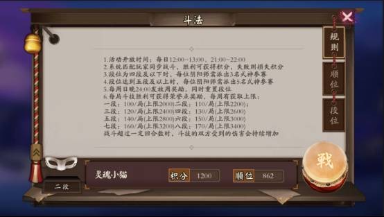 3、段位为四段及以下时,每位阴阳师需派出3名式神参赛。