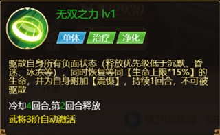 用于消除自己所有的负面状态(优先级低于沉默、昏迷、冰冻等),同时根据[生命上限*15%]恢复生命值,并在自身周围形成[震慑]环境,效果持续一个回合,且不可被清除。