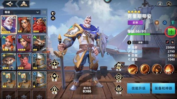 3、接下来进入到“英雄”界面,先点击右侧的“+”号来提升等级