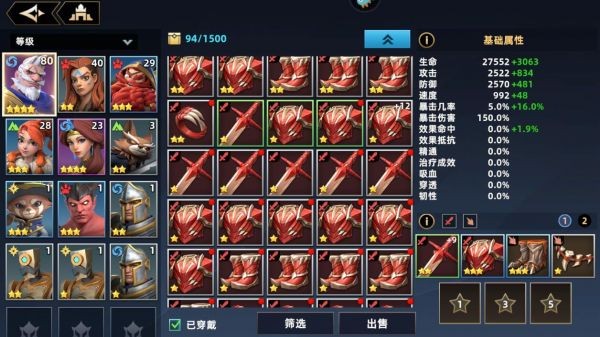 6、最后进入到“装备和神器”界面,首先为角色穿戴上各种武器和装备