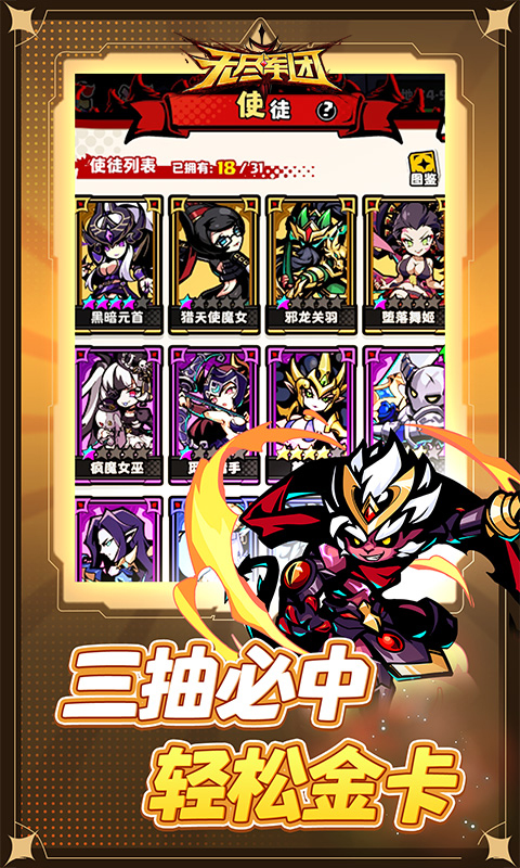 无尽军团是一款卡通画风的放置抽卡竞技游戏,玩家通过获取不同的卡牌角色来组成阵容,丰富的流派可以选择体验,使用你的阵容去地牢中不断的探索,去掠夺更多的弱者,卡牌角色都是通过抽取获得的,玩法有趣,感兴趣的小伙伴快来试试吧。