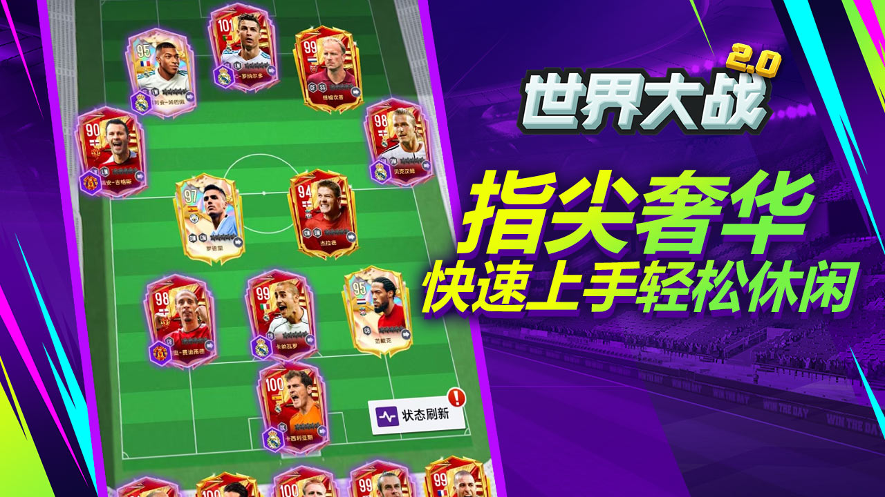 世界大战足球游戏是一款完美融球员养成、布阵对局、策略卡牌等一系列玩法为一体的手机游戏,这款游戏不仅能够为玩家营造出英超、西甲、意甲、德甲、法甲等一系列联赛而且更是塑造了一众真实的足球明星,玩家在这里可以根据自己的想法进行合理的排兵布阵、球员训练、战术定制,这样一来就能够轻轻松松赢下一场场比赛。