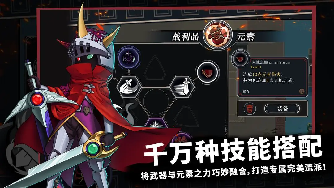 战斗内养成即获得的技能与元素之间搭配,也有商店功能,对于掉落的金币需要有少许统筹。