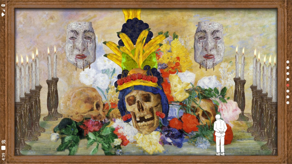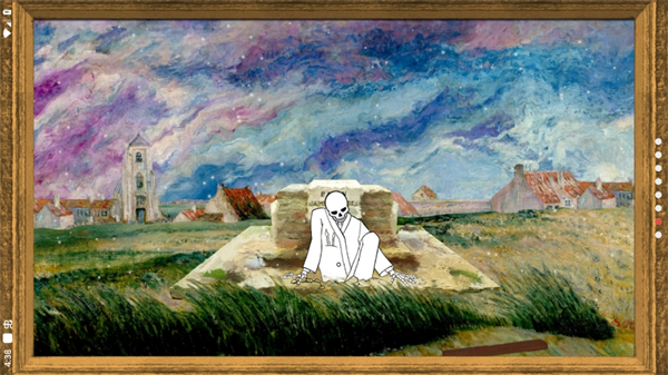 你是一个花花公子、穿着西装、热爱艺术的骷髅,最近从坟墓中复活,能够进入和穿越绘画。使用此能力,您可以帮助修复画作中的裂缝,并为生活在其中的人找到丢失的物品。