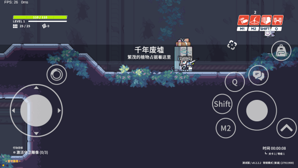 3、进入关卡后左边控制角色移动,右边是角色的技能按钮、射击按钮和跳跃按钮。