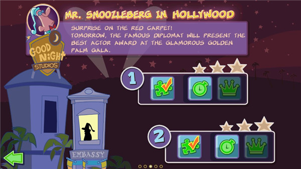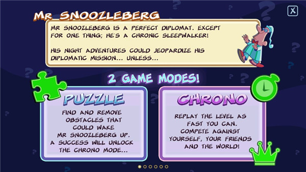 梦游先生1游戏是一款解谜烧脑的手机游戏,游戏采用卡通画风打造,蓝色调的夜晚场景中,房屋、星星和小狗构成宁静的画面,而戴着睡帽在屋顶行走的梦游先生却让夜晚充满危机。在游戏中,你需要帮助梦游先生安全回到住处,确保他能参加第二天的活动。游戏拥有8个常简称,城市、好莱坞、外星、游乐场、雪地、旅行、海底和实验室,每个主题有5个关卡,每关都有各种障碍和机关,你需要利用道具帮他化解危险。