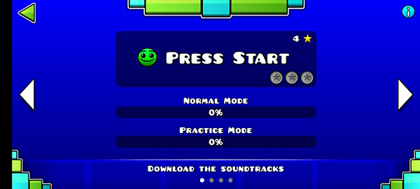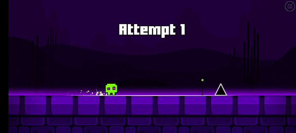 进入游戏前,你必须先要确定自己是否准备完毕了,因为一进入游戏中,你就得做好让方块跳跃障碍物的准备,有人会说缓不过神来的话可以先暂停一下子,但当你按了暂停键后你就会发现你完全看不见方块和障碍、的位置。因此小编认为,在不必要的情况下,尽量不要暂停键,不然继续游戏的那一瞬间,可能就是你重新游戏的时候了。