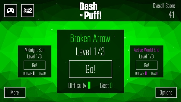 几何逃生手机版(Dash till Puff!)是一款由Rifter Games研发的类Flappy bird的休闲手游。玩家在游戏中只需要控制小圆球穿过一个又一个的图块障碍从而通关,看似非常简单,其实很考验玩家的反应力。在游戏关卡中有许多简约的障碍设计,还搭配了炫酷的背景与顶级的配乐,玩家在过关途中能看到场景颜色的不断渐变切换,在光怪陆离中体验小球成功穿梭障碍的成就感,简单但又富有挑战性。
