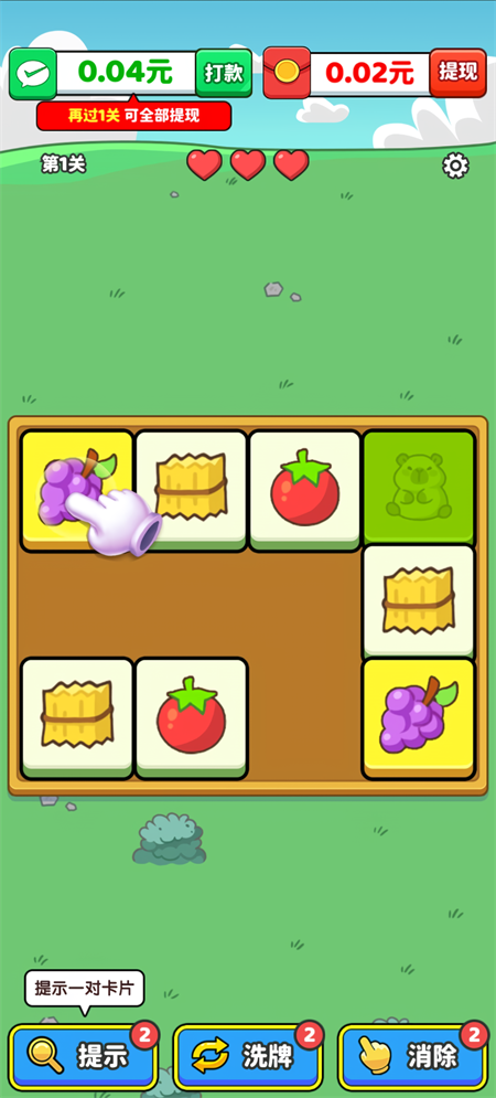 1、下载游戏后,跟随新手引导点击图案相同的卡牌进行消除。