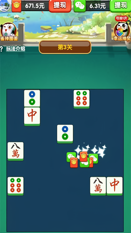5、雀了个雀红包版采用了独特的“同消”机制,只要让两个一样图形的方块连接起来。并且中间无阻碍,那么就能消除了。