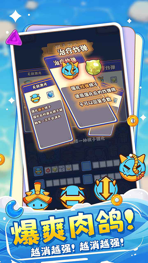 3、肉鸽元素:除了传统的三消玩法外,游戏还加入了肉鸽元素,为玩家提供了多种成长技能和道具选择。玩家可以根据自己的喜好和策略进行搭配,体验不同的游戏乐趣。