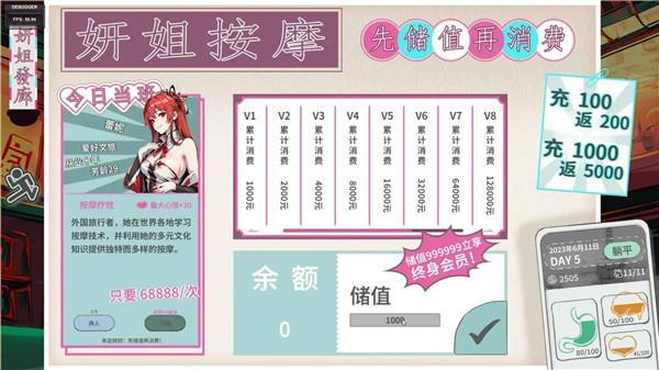 玩家不能直接用现金按摩,而是需要“充钱”,充100得200,充1000得5000,这是想调侃生活中开VIP卡的设定,你还可以累计消费总额,来提升你的会员等级。这种设定,是不是似曾相识?不过,这只是个单机游戏,不需要你真的付费充钱,只是一种调侃。