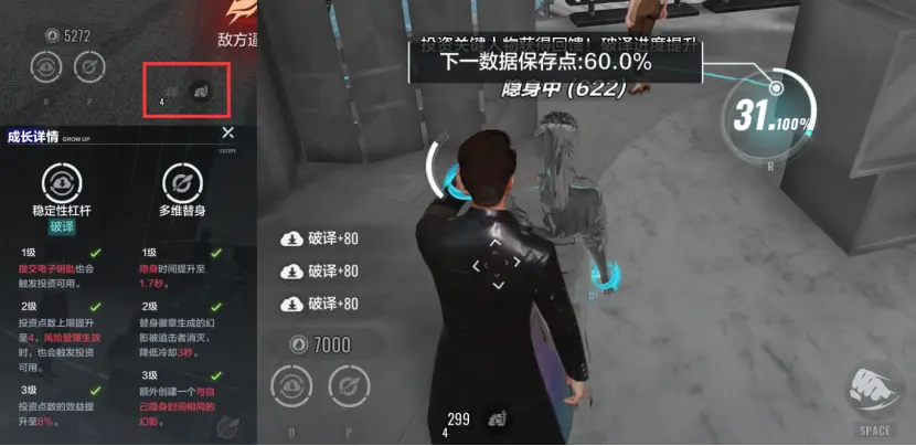 在对局中不断地去积累“投资点数”二级“杠杆”可以让我们投资点数上限增加到4,三级将倍率提升到8%,让我们在下次破译可以瞬间补满30%(4*8)的进度。