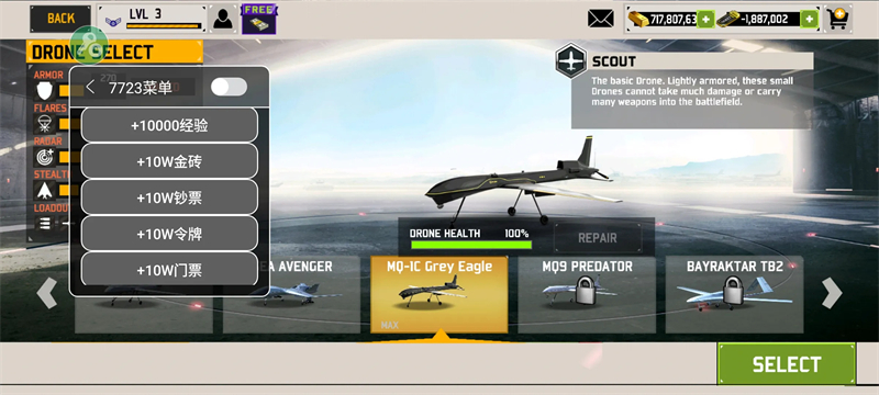 游戏每完成一个任务都会得到现金和金块的奖励,这些在飞机库设备升级中具有非常重要的作用,玩家不但能更换更加高端的无人战机,更能对枪械和炮弹进行升级,使它们发挥出更大的威力。战机不同的性能也是可以改善和提高的,它们会进一步提升战机的能力,在任务的执行中发挥出巨大的作用。