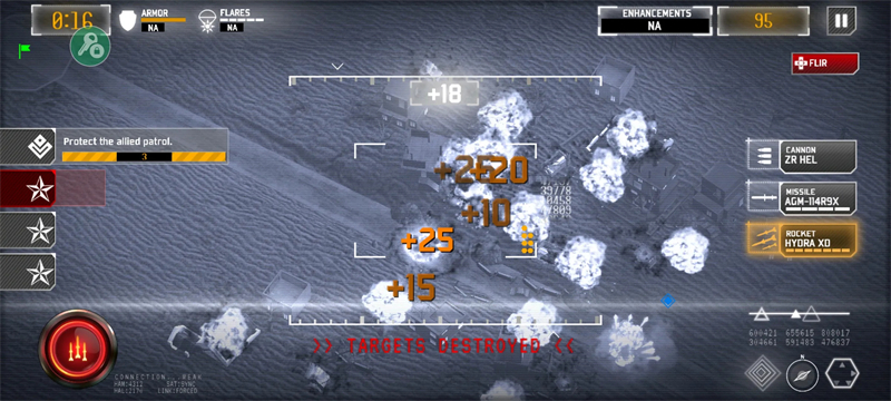6、投下的炸弹必须准确的击毁你的目标,如果偏差,那么你的任务就将会失败,考验你的战机驾驶技术。