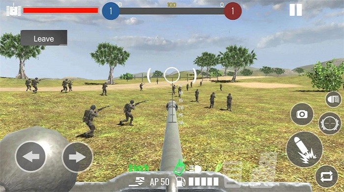 四、进入战场后,我们可以看到是坦克的第一人称视角,左边是摇杆操作移动,右边则是开火,在血条旁边的则是瞄准镜,非常有意思的是,当你击出一炮弹后,会有一个5秒的重新装弹时间,点击下方的小子弹则可以选择机枪模式,炮弹击出还可以看到真实的炮弹下落情况,不得不说,这物理引擎蛮有意思的。
