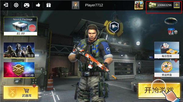 1、打开在开心电玩下载的打击力量英雄无限金币版,进入首页我们可以看到有阵营、排行榜、武器库等等功能板块,我们可以先点击齿轮状的设置键。