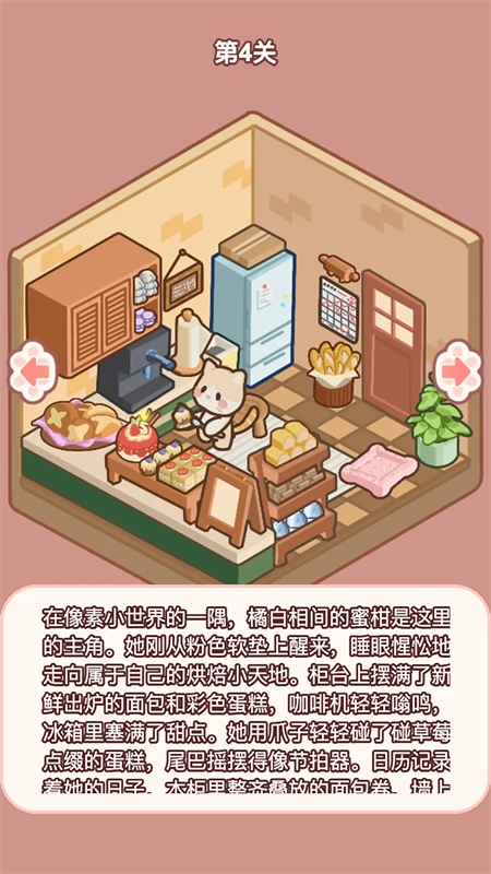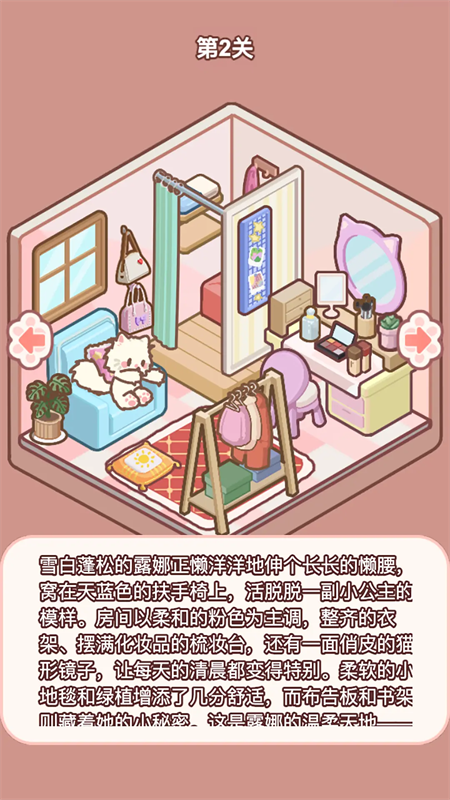 喵居物语手游是一款轻松治愈的手机端猫房装饰游戏,玩法非常的简单:跟随指引将列表中的家具和猫放置到房间中正确的位置即可过关!每个关卡都是一个独特的房间,从温馨卧室到时尚客厅,都在等待你的布置。在过关途中,你会感受到一座座喵居在你的手中不断成型,还有生动的喵居小故事和可爱猫咪,在闲暇之余治愈你的心灵,让你在一天的疲惫当中找到惬意的安息之所。