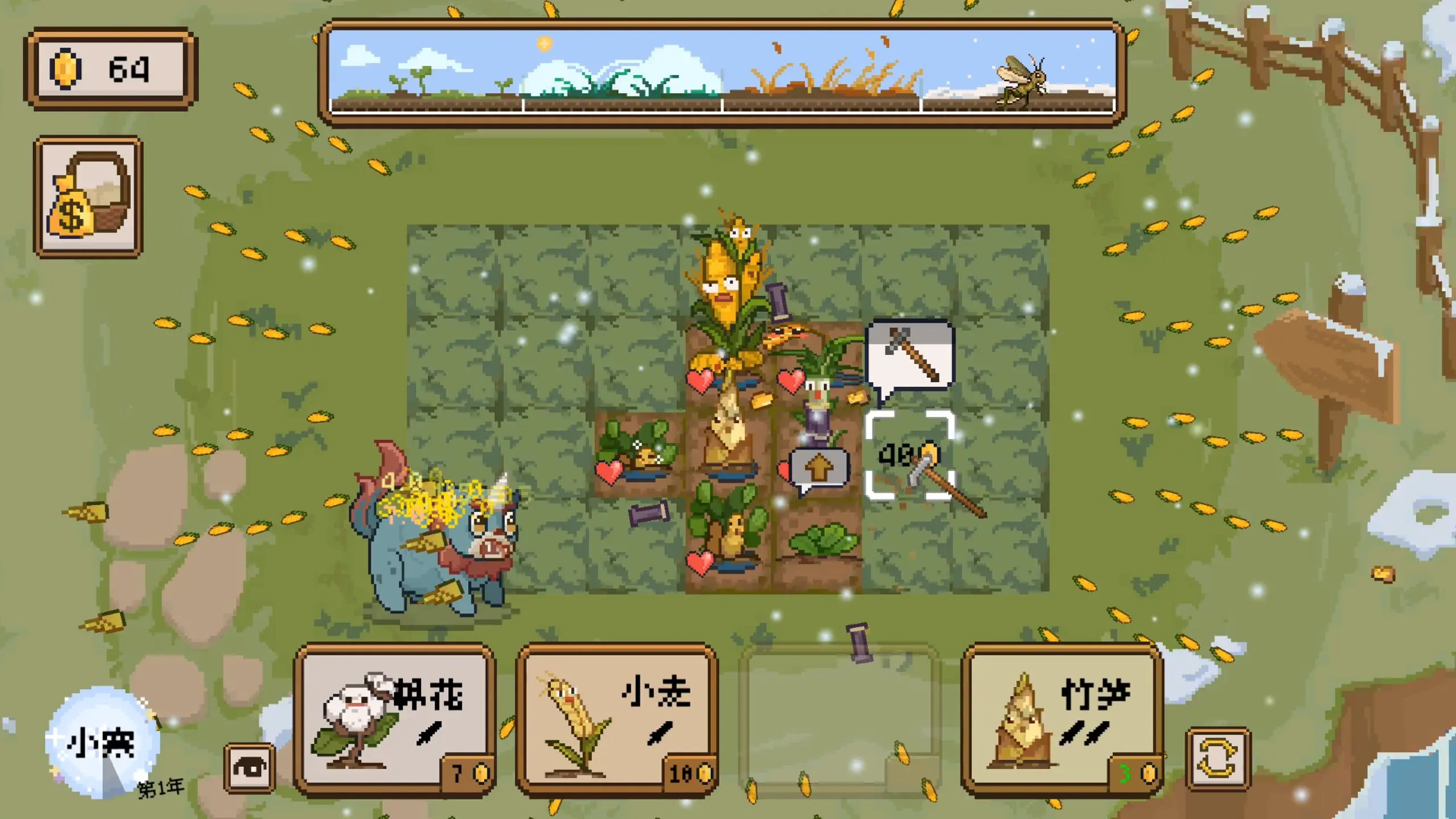 游戏内季节更替直接影响植物生长周期,玩家需在有限时间内应对“蝗虫军团”侵袭,并在年末通过策略布局击败年兽BOSS。时间压力与资源管理构成核心挑战。