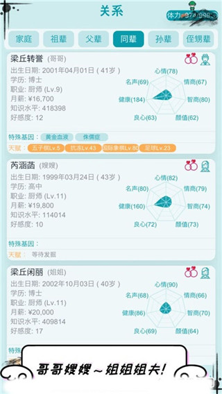 3、过第一个生日是抓阉,这个会关系到后续发展。解锁【族谱】【亲人】分支。