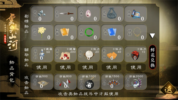 收集战斗武器的话,“袖箭”可以晚上去练武场刷出来,“自制手雷”可以晚上去武器阁,10%的概率,可以提前存档反复刷出来。实战的话,注意补充生命值和体力值,缺一不可;用洛书加修为,只用武器更方便但是不加修为,打败BOSS会额外再加修为。