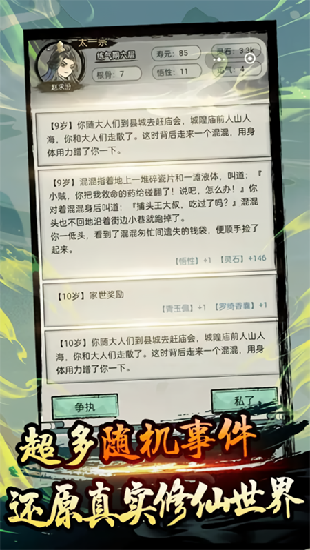 我们为不同运气、家世、天赋、传承、宗门的人生各设计了多种主线剧情,而且不同的机遇、不同的选择,也会带来不同的人生经历。