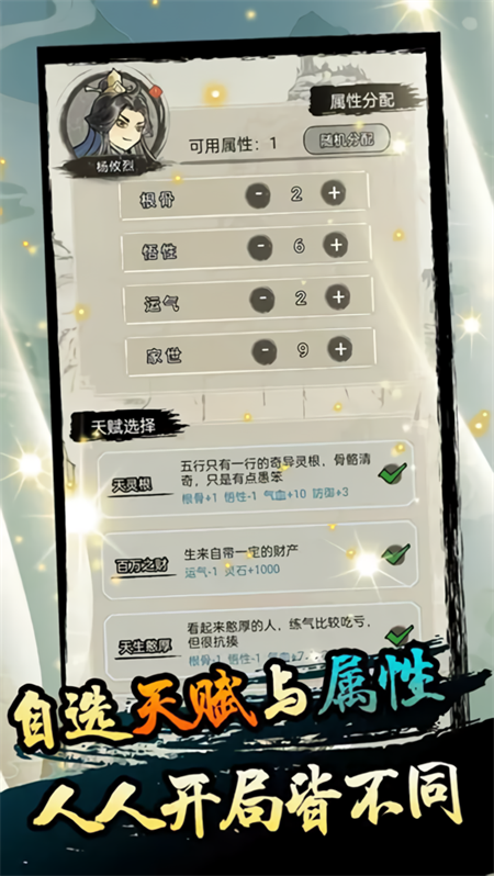 人物有寿元、境界、灵气、天赋、传承、宗门、根骨、悟性、运气、家世等属性,其中后四项在每一生开始时可以选择。