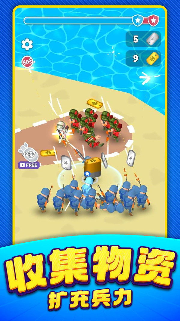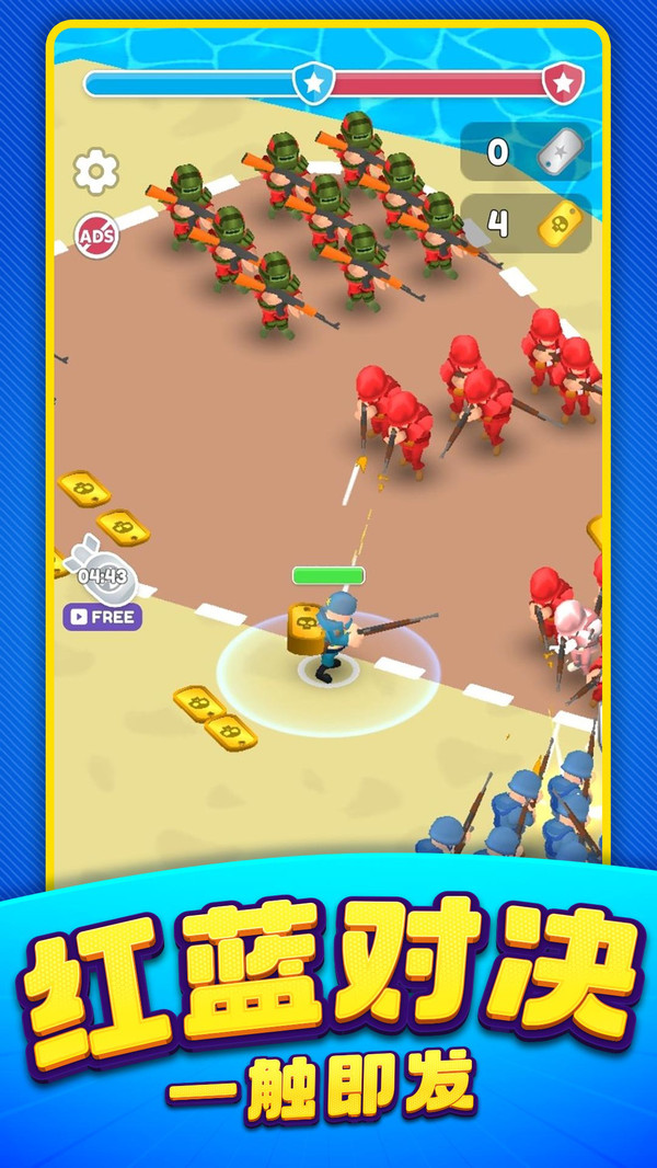 小兵特工队游戏官方版是一款超级好玩的的即时战斗类策略休闲手机游戏,相信不少玩家刷到过类似的游戏广告,但是广告中的操作看着让人非常难受,现在下载这款游戏,你就可以亲手操作,扮演指挥官、招募士兵,建立自己的强大军团,游戏中有好几种模式,玩家需要不断收集物资,升级军团,红蓝阵营的对抗一触即发,发挥指挥才能排兵布阵击退来敌。