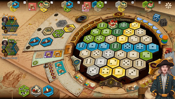 3、游戏共分为五轮(A轮-E轮),每一轮又分为五个回合,每个玩家每个回合都有两颗骰子可以使用。这样一盘游戏下来估计约有共50颗骰子可供使用。玩家操作的顺序按照船的顺位来决定。