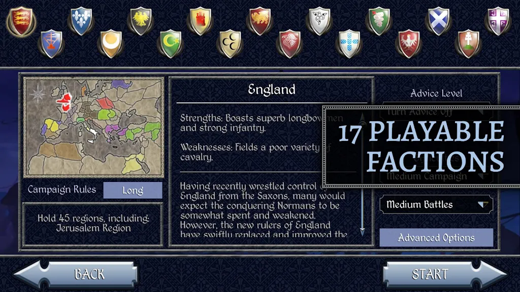 中世纪2全面战争手游中文版能够为玩家提供17个可以游玩的派系并且更是加入了步兵、弓箭手和骑兵等一系列兵种类型,玩家在这里可以根据自己的想法进行自由组合,从而能够衍生出多种游戏套路,可以轻轻松松应对各种猛烈攻势。此外,该游戏还加入了联盟、贸易等一系列玩法内容,使得游戏可玩性上升几个等级。