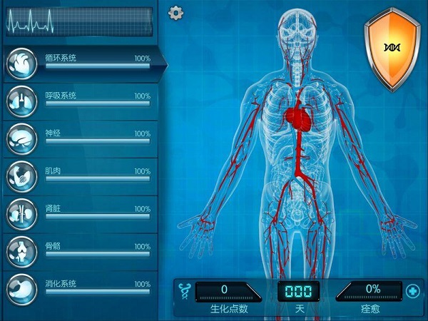 游戏共有八大系统(和人体一样):循环系统(Circulatory)、呼吸系统(Respiratory)、神经系统(Nervous)、肌肉(Muscular)、肾脏(Renal)、骨骼(Skeletal)、免疫系统(IMMUNE)。