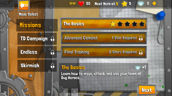 1、首先当然先从单人战斗中的任务模式说起,这也是本作的基础和教学。在任务模式中可以指挥两个虫虫英雄完成歼灭敌人、限时生存、捣毁敌人巢穴和保卫基地等多种任务,任务模式中的前5关左右为教学关卡。