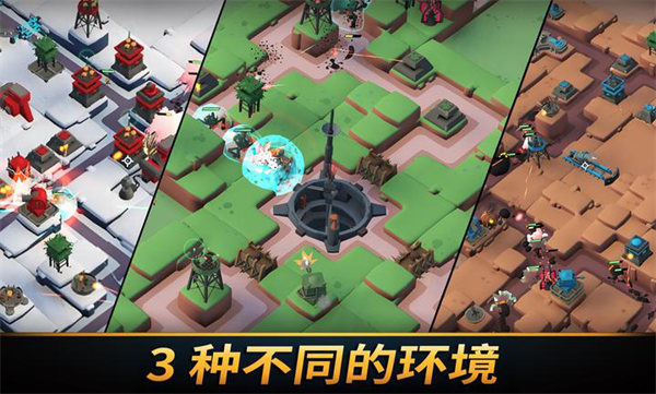 同时, 英雄单位也是战场上不可或缺的力量。玩家可以选择10位不同的英雄,每位英雄都拥有独特的技能,例如范围冰冻或召唤无人机等,他们可以被部署在战场的关键位置,为防御塔提供强有力的支援。游戏提供了 三大阵营的差异化的战术选择,使玩家能够体验到多样化的战略与战术组合。