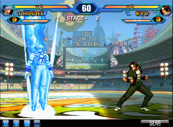 2、在招式上,除了基本的攻击之外,也实现了投技,防御反击技,取消,超级取消等。连续技是本游戏中的一大重点,必杀技可以取消普通技,爆气后必杀技可以接必杀技甚至超必杀技,从而可以组合成各种连续技。。