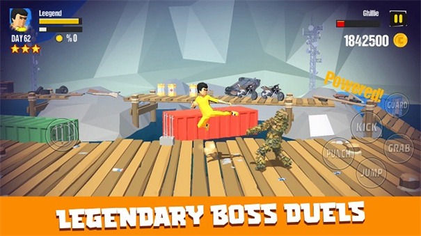 6、当敌人出现时,点击右侧的攻击按钮(PUCH、KICK、JUMP、GRAB)来进行攻击和躲避。