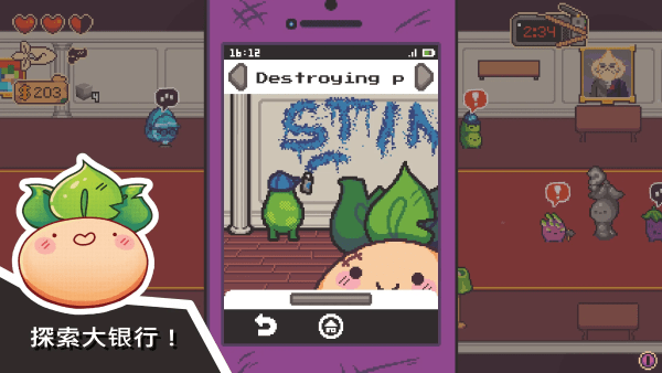 大头菜小子银行大冒险破解版是一款动作冒险游戏。采用非常经典的像素画面制作,搭配上俯视角的游戏模式,大大提升了玩家游戏体验。游戏设定在一个拟人化的蔬菜王国,玩家将扮演叛逆少年大头菜,为了摆脱无聊的生活而做出了一个大胆的决定。
