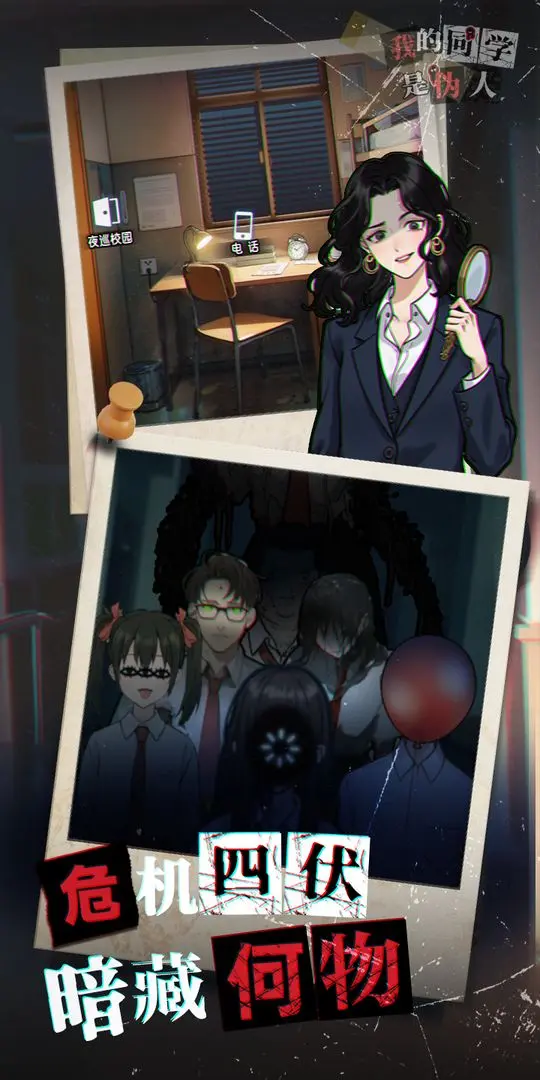 我的同学是伪人官方版是一款校园冒险题材的策略卡牌手游,玩家在游戏中扮演一所学校的保安,但是原本平静的校园就被伪人入侵了!而玩家的目标自然是保护校园的安宁了,白天玩家需要进行校风纠察,找出潜藏的伪人,而夜晚,则是玩家直面伪人,用策略搭配不同装备开拍,将伪人消灭的时刻!