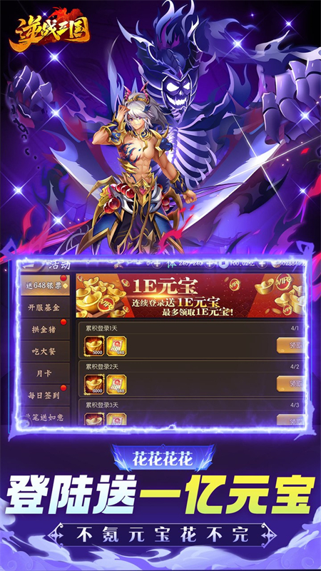5、登陆送1E元宝、推图刷主线疯狂送10连抽,无限抽各种神将。