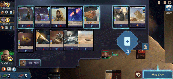 4、展示阶段:如果没有特使可用或不想再派遣,玩家展示手牌,获得展示收益。