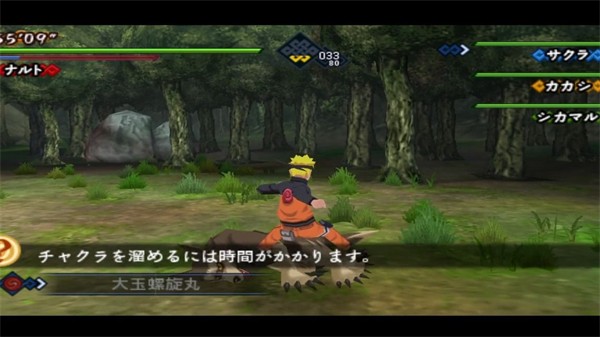 本作最大的亮点应该就是这个4人一个小组的任务模式了。有了火影忍者中的众多人气角色,再加上类似怪物猎人和噬神者的战斗系统,一定能笼络不少玩家的心吧。本作的故事中的战斗都是以4人一个小队共同对抗敌人的方式进行的。在剧情模式中,玩家们选择章节之后,就可以进行人物的选择。玩家想要操作的角色可以自由选择,队友方面有剧情固定的,也有可以自由选择的时候。队伍组建好了之后就可以开始任务了,只要在规定的时间内完成相应的任务就可以过关,继续下面的章节,并且还可以获得强化人物的道具呢。