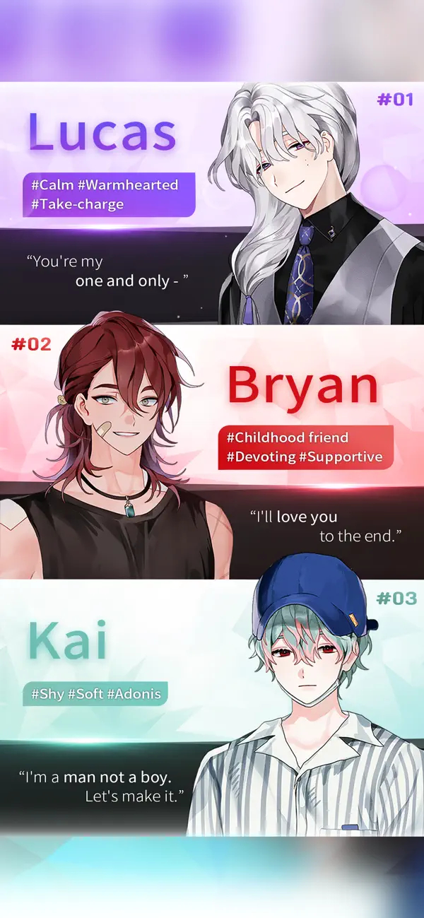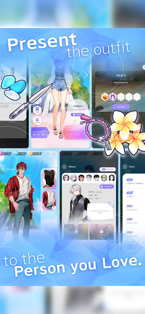 玩家们会很高兴欣赏一群美丽而有才华的角色。每个角色都有不同的设计。从发色到穿着的服饰,都是用不同的颜色打造,让很多玩家更加感兴趣,印象深刻。不仅如此,每个角色都有自己的故事。你可以和他们聊天,了解他们更多的爱情生活故事。请分享,同情,支持他们,帮助他们感受这样充满爱的生活。